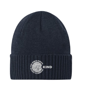 Stay warm and spread kindness with our navy blue rib-knit cuff beanie. Made with soft, cozy material, this beanie features embroidery in white string for a clean and classic look.